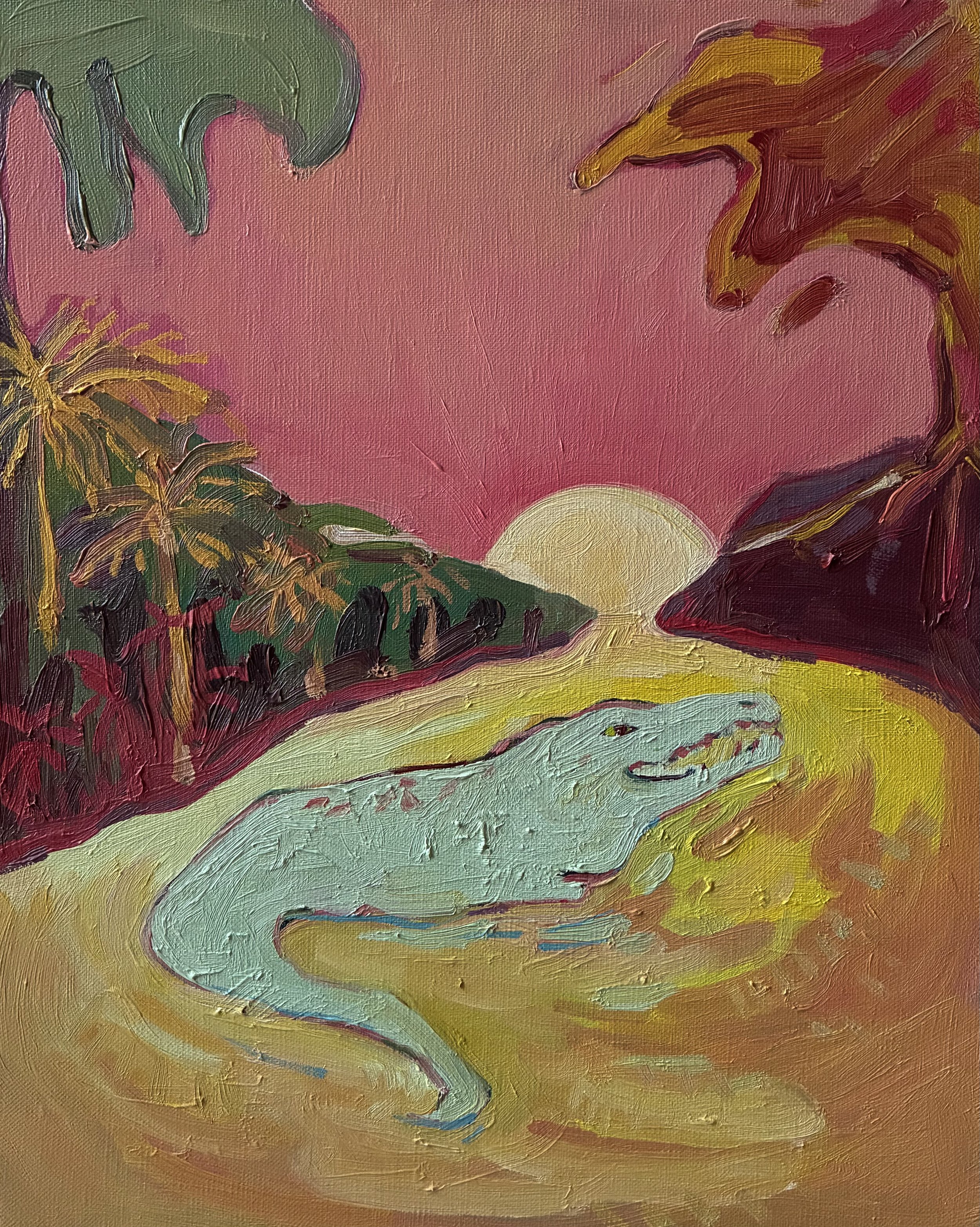 Crocodile-man bathing in the sunset, 2025